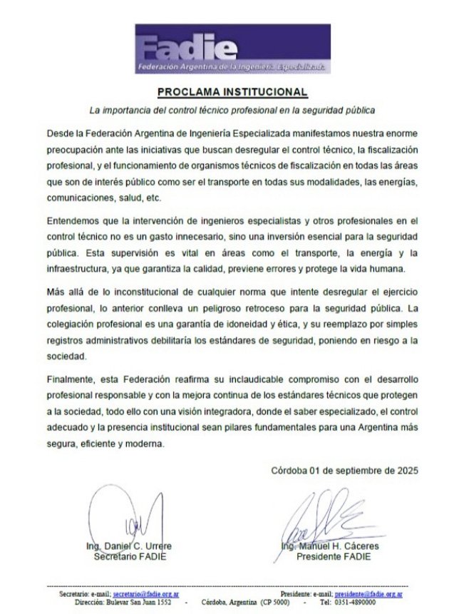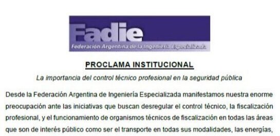 Desde la Federación Argentina de Ingeniería Especializada (FADIE) manifestamos nuestra enorme preocupación ante las iniciativas que buscan desregular el control técnico y la fiscalización profesional en áreas de interés público como transporte, energías, comunicaciones y salud.